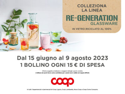 Lasciati conquistare dall’esclusiva linea di prodotti firmati RE-GENERATION in vetro 100% riciclato e inizia a raccogliere i bollini.