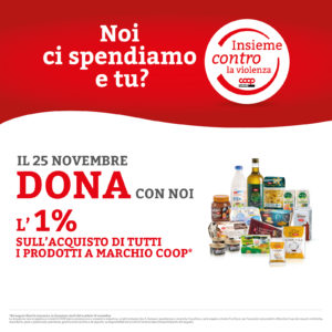 Nel corso della giornata del 25 novembre verrà donato l’1% sull’acquisto di prodotti a marchio Coop a sostegno di 4 centri antiviolenza della Lombardia. Nei negozi chiusi la domenica, la donazione verrà fatta sabato 24 novembre.