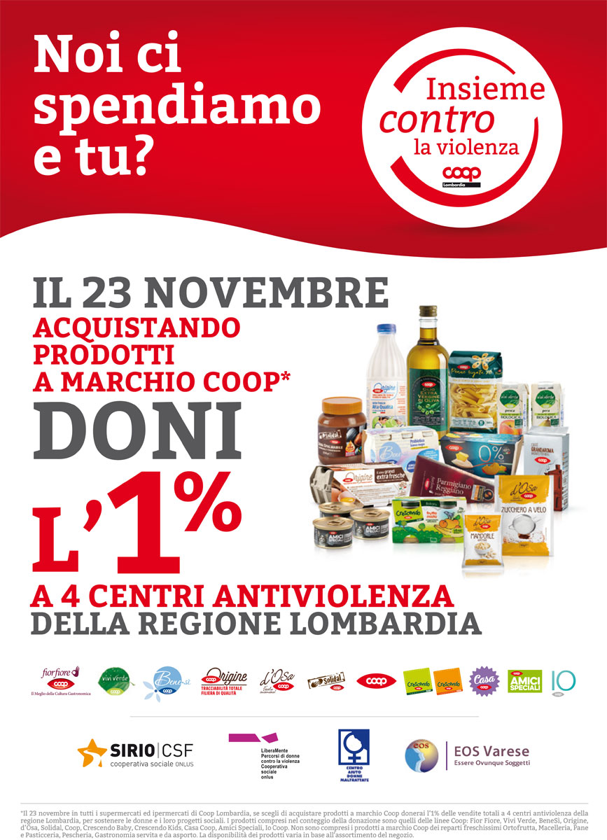 Il 23 novembre Coop Lombardia attiverà la campagna “Noi ci spendiamo e tu?”, donando l’1% del ricavato della vendita di tutti i prodotti a marchio Coop a 4 centri antiviolenza della regione Lombardia.