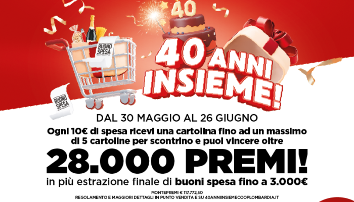 E ricorda di conservare la parte di cartolina con il codice univoco, poiché ti permetterà di partecipare all’estrazione finale, che mette in palio buoni spesa fino a 3.000€! Inquadra il QR Code presente sulla cartolina o visita il sito www.40anniinsiemecooplombardia.it e gioca il tuo codice entro il 26 giugno 2024.