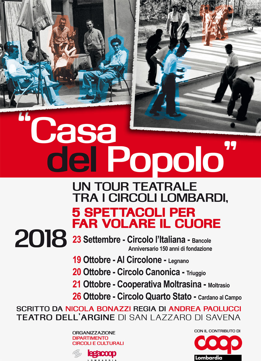 Un’iniziativa inedita per i Circoli in Lombardia, organizzata dal Dipartimento Circoli,Cultura e Media di Legacoop Lombardia e Coop Lombardia, per raccontare, attraverso uno spettacolo teatrale, la centenaria esperienza dei Circoli cooperativi e Case del popolo in tanti luoghi d’Italia.