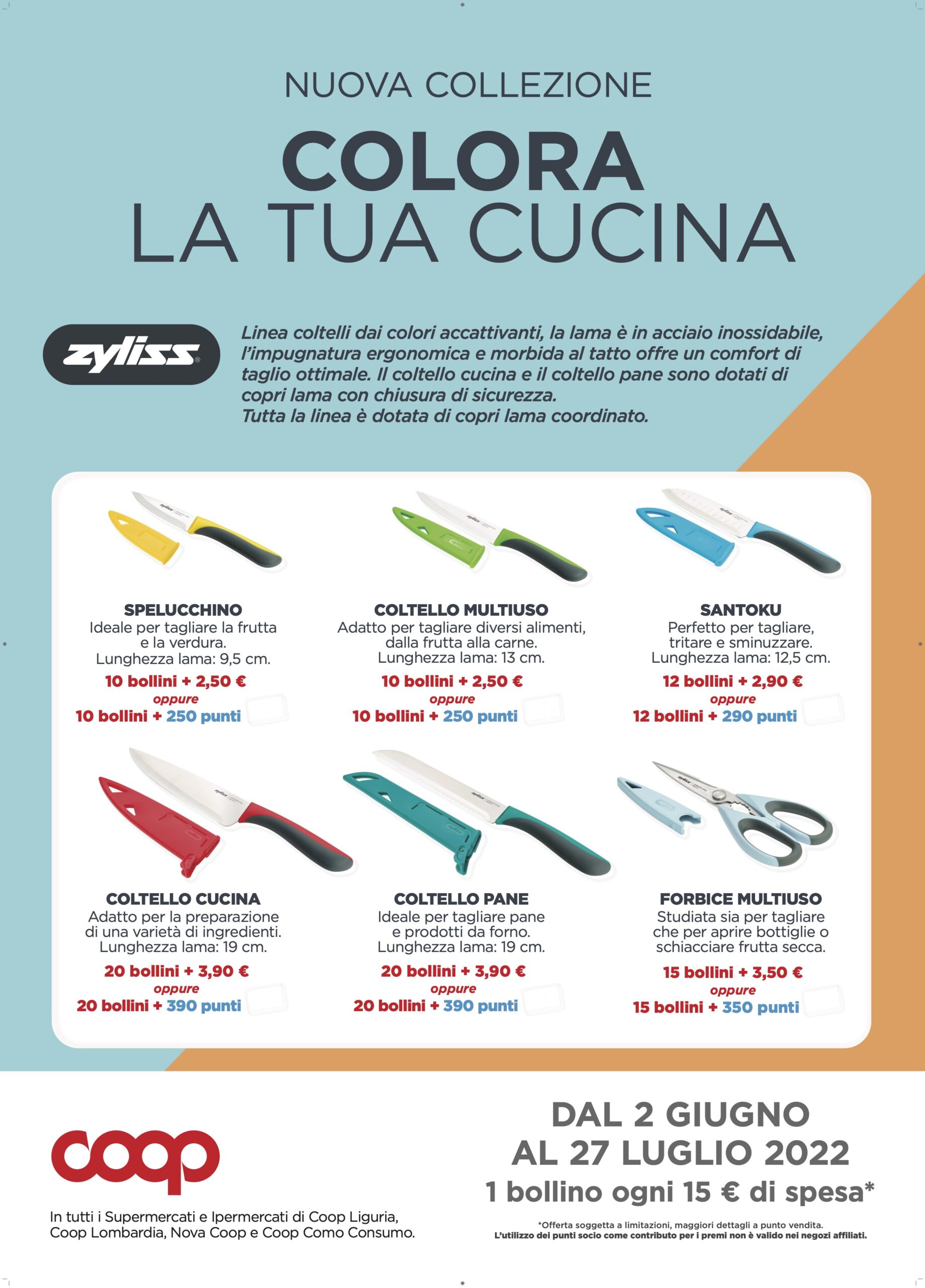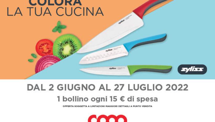 Colleziona tutti i prodotti di Zyliss e colora la tua cucina: con la tua spesa, dal 2 giugno al 27 luglio 2022, otterrai un bollino ogni scontrino da 15€ o multipli. Aggiungendo un piccolo contributo o utilizzando i tuoi punti SocioCoop, potrai ritirare un prodotto in esclusiva!