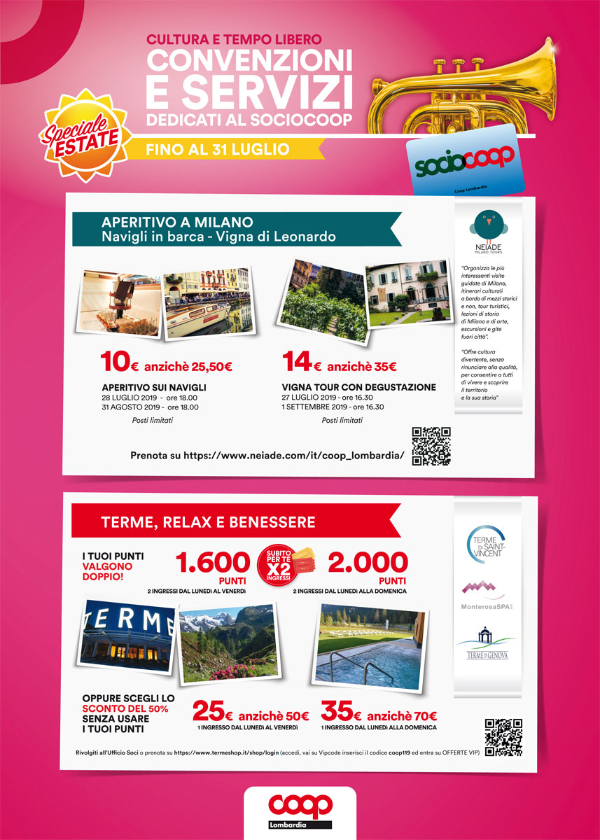 Convenzioni per i Soci Coop: terme, relax e benessereCon l’arrivo dell’estate abbiamo pensato a delle speciali convenzioni per i Soci Coop: dall’11 al 31 luglio prenota una pausa alle terme o un aperitivo a Milano in totale relax!