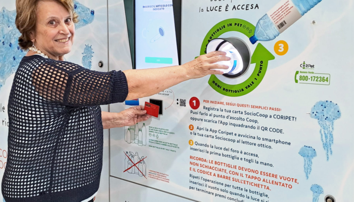 – Utilizza l’ecocompattatore: passa la tua Carta Socio Coop o scannerizza il codice QR sul macchinario attraverso l’App Coripet per farti riconosce e segui le istruzioni sullo schermo. Inserisci solo bottiglie in PET che contenevano liquidi alimentari. bottiglie devono essere vuote, non schiacciate e con l’etichetta integra affinché l’eco-compattatore possa leggere correttamente il codice a barre.