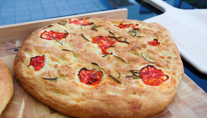 Preparazione, cottura e degustazione della tipica focaccia barese condita con pomodorini freschi e olive.