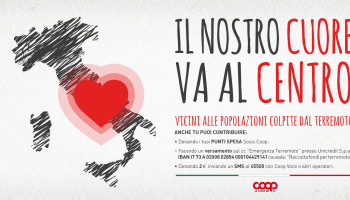 Da oggi e fino al 13 novembre, il ricavato della vendita dei prodotti Coop, su tutto il territorio nazionale, andrà a sostegno delle popolazioni colpite dal terremoto. Tutte le cooperative di Consumatori doneranno insieme 3.000.000 di Euro, come impegno minimo di devoluzione. Un gesto importante e un sostegno concreto arriva anche dall’operatore telefonico CoopVoce, che ha accreditato gratuitamente 20 euro a tutti i suoi clienti residenti nelle aree colpite dal sisma, per aiutarli nelle comunicazioni, e attivato, già ad agosto, la raccolta fondi nazionale tramite sms solidale, con una donazione di 2 euro al numero 45500 della Protezione Civile.