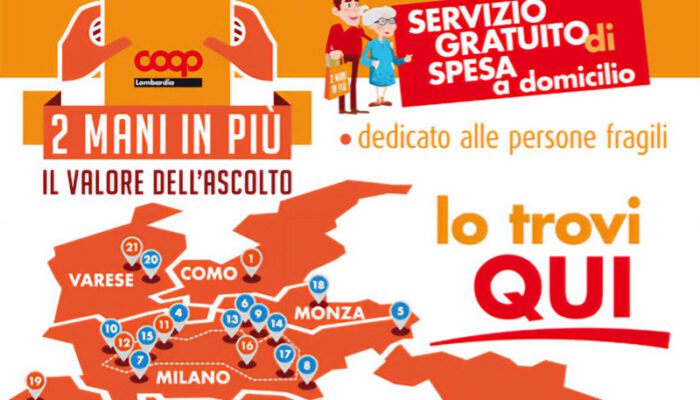 Il servizio, che si è mostrato particolarmente rilevante durante la pandemia, quando “Due mani in più” ha fornito un aiuto concreto a chi era costretto in quarantena, è attualmente attivo presso i punti vendita di Bergamo (Coop di via Broseta), Cremona (Coop Del Sole e di Ca’ Del vescovo), Milano (Coop di Bollate, Cinisello Balsamo, Corsico, Peschiera Borromeo e Sesto San Giovanni), Milano Città (Ipercoop di Bonola, Ipercoop La Torre di Baggio, Coop di Milano via Ornato, Palmanova e Zoia), Monza (Coop Arcore) e Varese (Coop Malnate).