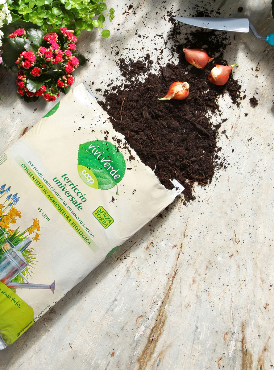 La gamma di terricci Vivi Verde è stata quindi creata per consentire ai consumatori di coltivare le piante di casa, dell’orto e del giardino senza che questa attività possa rappresentare un’ulteriore accelerazione del rilascio di carbonio in atmosfera. Per questo abbiamo chiesto al nostro fornitore di terricci di produrli in impianti che utilizzino esclusivamente energia verde, e di utilizzare almeno il 60% di plastica riciclata nella realizzazione degli imballaggi in plastica.