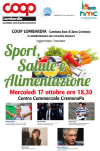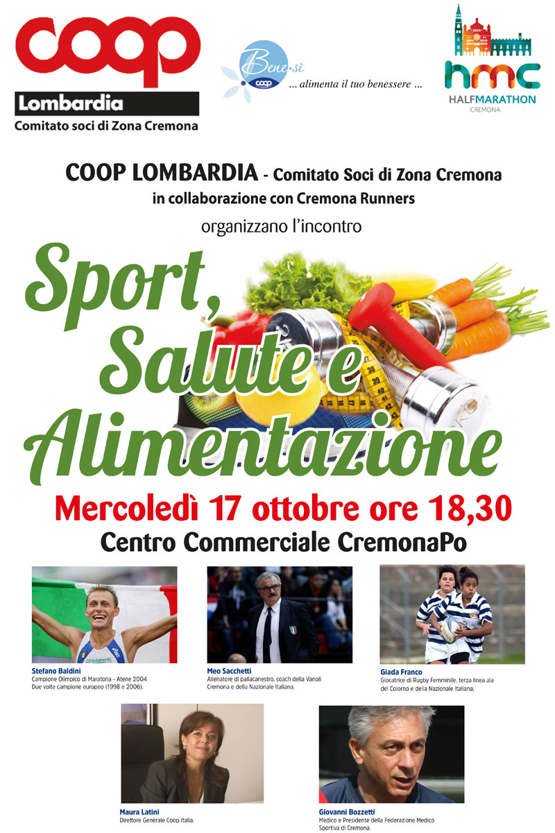 Per l’edizione 2018 la collaborazione si è intensificata, e la mezza maratonina sarà preceduta dall’evento Sport, salute e alimentazione, che si terrà mercoledì 17 ottobre a partire dalle 18:30 presso il centro commerciale di Cremona Po. Il convegno, organizzato insieme a Cremona Runner, approfondirà i temi che accomunano la Cooperativa allo spirito della maratona: il benessere della persona tramite l’attività sportiva e la sana alimentazione. All’evento saranno presenti: il campione olimpico di Maratona Stefano Baldini; l’allenatore della Vanoli e della Nazionale Meo Sacchetti; il medico sportivo Dottor Giovanni Bozzetti; l’atleta di rugby del Colorno e della Nazionale Giada Franco; e il direttore generale di Coop Italia Maura Latini.