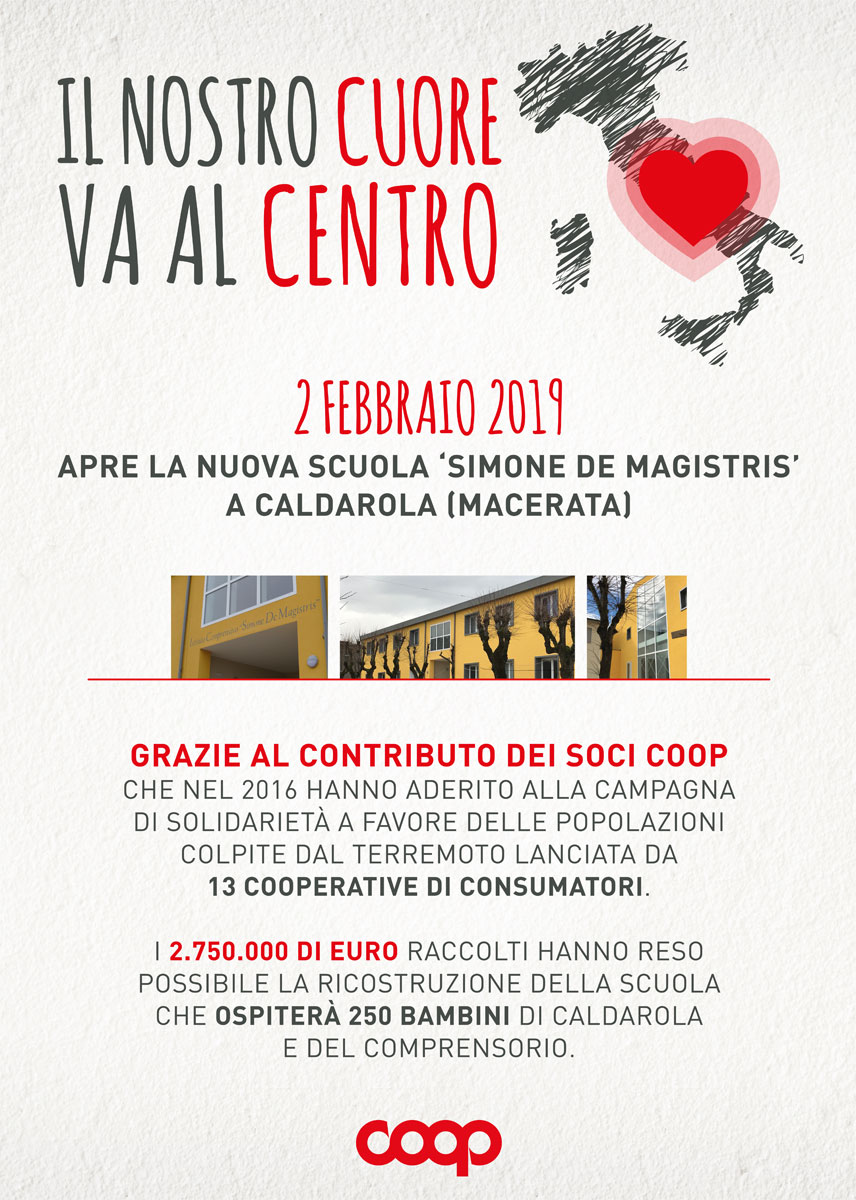A distanza di 2 anni dal terremoto del 2016 che ha colpito il centro Italia, sabato 2 febbraio apre la nuova scuola di Caldarola, in provincia di Macerata, grazie al prezioso contributo dei Soci Coop e di 13 cooperative di consumatori.