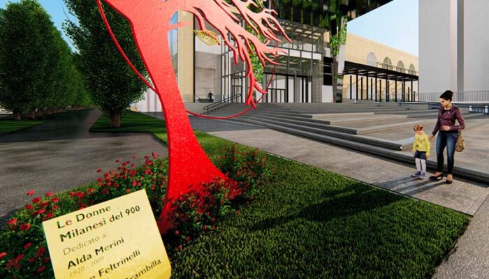 Giovedì 9 giugno abbiamo presentato ufficialmente, inaugurando l’opera, l’albero delle donne milanesi del Novecento, una scultura omaggio alla memoria di tre grandi donne che hanno vissuto e operato a Milano: la poetessa delle terre promesse Alda Merini, la fotografa tedesca Inge Feltrinelli, divenuta qui editrice, e la partigiana Onorina Brambilla.