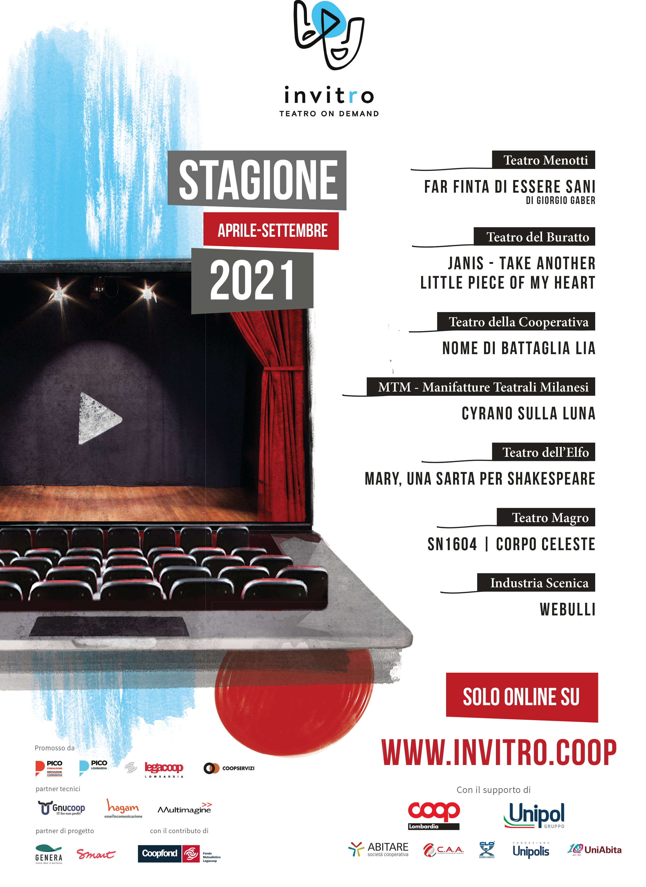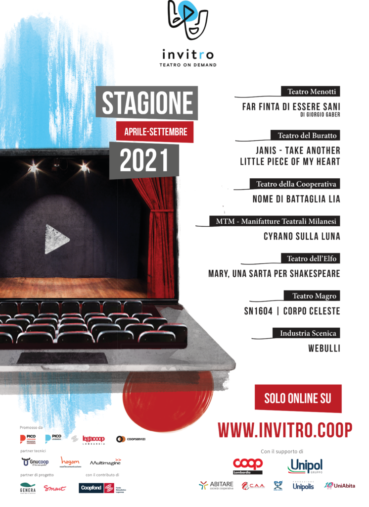 Il progetto Invitro è un esperimento cooperativo al quale hanno aderito i teatri milanesi Teatro dell’Elfo, Teatro del Buratto, MTM Manifatture Teatrali Milanesi, Teatro Menotti, Teatro della Cooperativa, Teatro Magro di Mantova e Industria Scenica di Vimodrone. Il progetto è nato nell’ambito delle iniziative di innovazione digitale promosse da Fondazione Pico, Digital Innovation Hub di Legacoop, con Legacoop Lombardia e Coopservizi, in collaborazione con partner appartenenti al mondo cooperativo lombardo quali Gnucoop, Hagam, Multimagine, Genera e Smart.