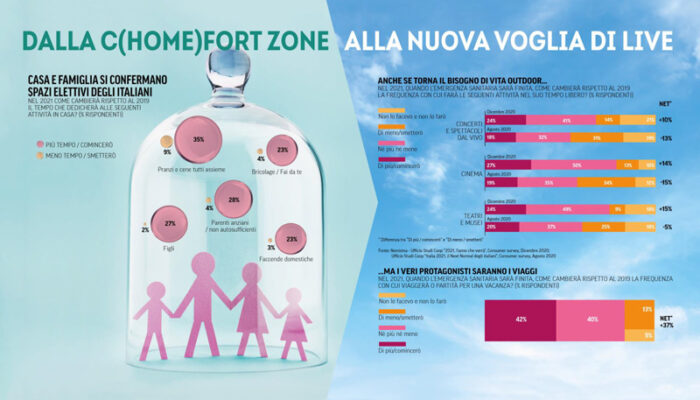 L’effetto della pandemia si fa sentire: speranza è la parola che meglio descrive l’anno appena iniziato, accompagnata però dalla volontà di cambiamento e dall’intenzione di rivedere le priorità della propria esistenza. Gli italiani sono in cerca di nuovo equilibrio fisico e psicologico. Sempre attenti al benessere e anche all’ambiente, l’Italia assiste al tramonto di alcuni ruoli (media e politici in testa) e alla nascita di nuovi eroi (medici e scienziati). Il virus ha funzionato come un catalizzatore di trasformazioni e mentre alcune delle abitudini da lockdown si consolideranno, in parte altre saranno invece superate e ribaltate.