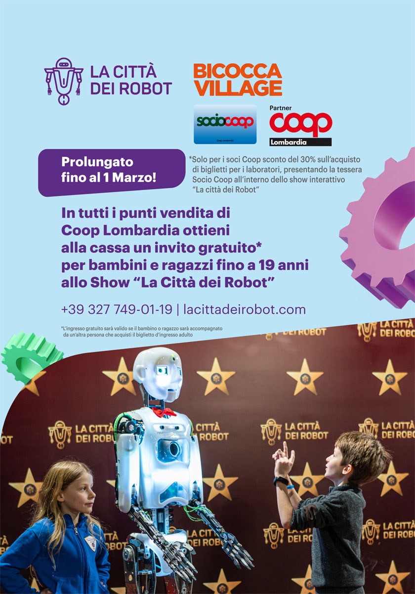 Allestito all’interno del Bicocca Village, proprio nello spazio adiacente al nostro Supermercato del Futuro, l’evento interattivo high-tech ha attratto da dicembre tantissimi bambini, ragazzi e genitori che hanno avuto l’opportunità di interagire con 72 esemplari di robot provenienti da tutto il mondo.