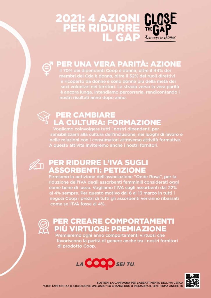 Da parte di Coop non c’è nessuna pretesa di risolvere un problema che necessita di molti interventi, ma sicuramente è sentita la volontà di fare la propria parte. L’iniziativa e le azioni di “Close the Gap – riduciamo le differenze” nascono quindi con questo scopo: portare avanti un atto simbolico ma concreto, perché la lotta alle disuguaglianze e per la parità di genere inizia proprio dai piccoli gesti.