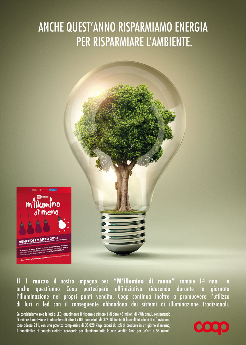 Anche quest’anno Coop aderisce all’iniziativa M’illumino di meno e venerdì 1 marzo negli oltre 1100 punti vendita Coop ci sarà il “silenzio energetico”, con lo spegnimento simbolico delle luci e la possibilità di ascoltare, attraverso Radio Coop, la diretta di Caterpillar, la radio promotrice dell’iniziativa.