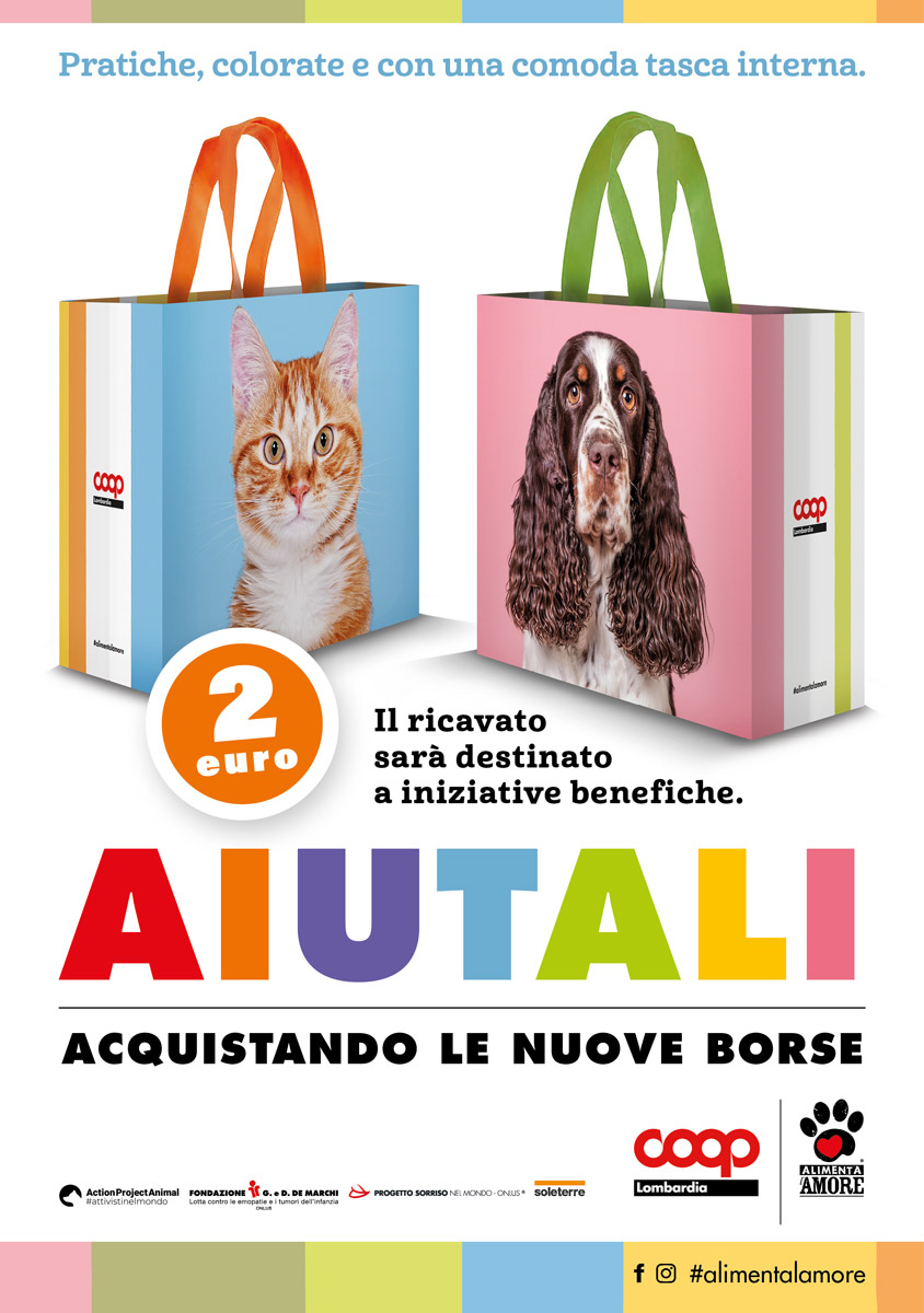 Bellissime nelle due versioni cane e gatto, le borse colorate per l’estate, sono da usare non solo per fare la spesa ma anche per le attività di tutti i giorni. I protagonisti, ritratti dalla fotografa Silvia Amodio, non sono immagini di stock ma due amici di Alimenta l’Amore: Rosie il cane e Simba il gatto. Alimenta l’Amore è una campagna, nata nel 2014 sostenuta da Coop Lombardia che promuove una corretta relazione tra uomo e animali e sostiene attività benefiche. Ad oggi sono stati distribuiti circa 2 milioni di pasti agli animali in difficoltà. Alimenta l’Amore collabora da molti anni con il disegnatore Bruno Bozzetto e Silvia Amodio nella realizzazione di operazioni editoriali il cui ricavato sostiene attività charity.