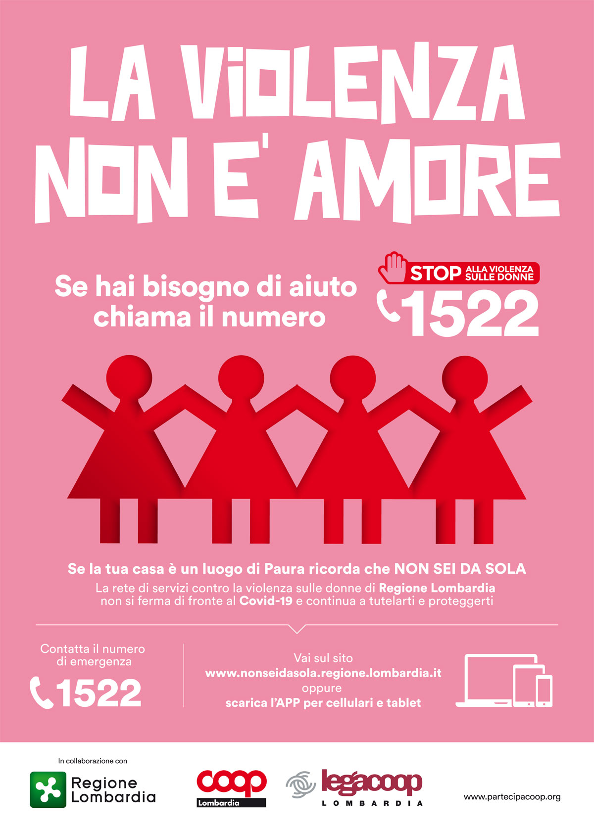 In tutti i negozi Coop Lombardia, un messaggio diffuso tramite Radiocoop ricorda il numero di emergenza antiviolenza e stalking 1522, e le modalità di contatto dei centri antiviolenza della Regione, attivi 24 ore su 24.
