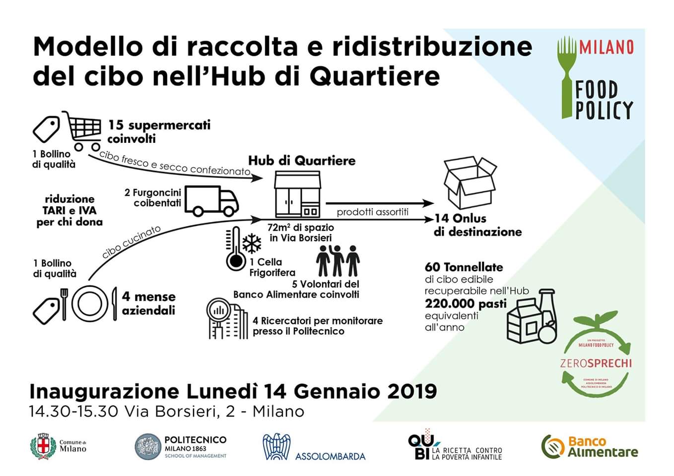 L’apertura dell’hub, nato dal protocollo ZeroSprechi, condiviso nel 2016 tra il Comune di Milano, Assolombarda Confindustria Milano Monza e Brianza e il Politecnico di Milano, si pone l’obiettivo di ridurre lo spreco di cibo e innovare le modalità di recupero degli alimenti da destinare a chi ne ha più bisogno, progettando e sperimentando un modello di recupero e ridistribuzione delle eccedenze alimentari basato su reti locali di quartiere.
