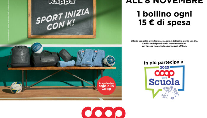 Nei negozi Coop Lombardia è arrivata una nuova, esclusiva collezione! Raccogli i bollini e riscopri il piacere di muoverti con i premi firmati Kappa, dedicati a tutti gli amanti dello sport e dell’attività fisica. Riceverai un bollino adesivo ogni 15€ di spesa, ma puoi ottenerne di extra acquistando i prodotti contrassegnati come sponsor.Dagli accessori per la palestra e la piscina, ai palloni per giocare, c’è solo l’imbarazzo della scelta: