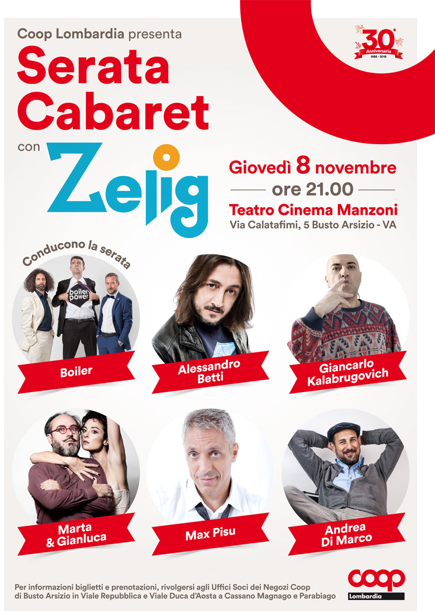 In occasione dei 30 anni del supermercato Coop di Busto Arsizio in viale Repubblica giovedì 8 novembre il Teatro Cinema Manzoni ospiterà una serata cabaret con i comici di Zelig.