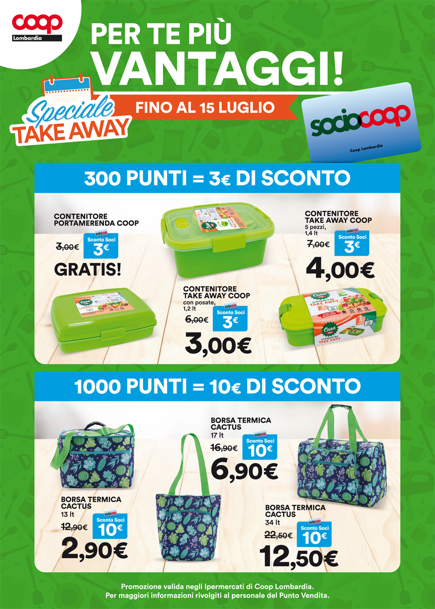 Caro Socio Coop per te ci sono sempre più vantaggi: fino al 15 luglio potrai utilizzare i tuoi punti per lo Speciale Take Away e rendere perfette le tue gite estive.